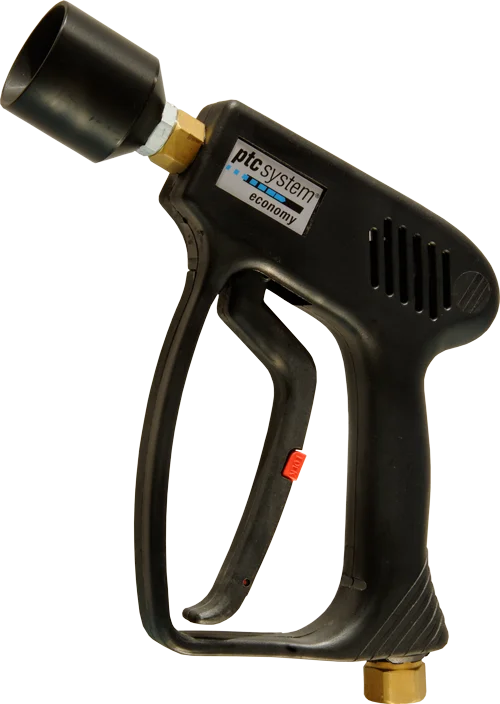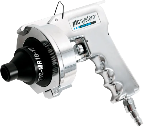Die verchromte Pistole aus hochfestem Aluminium ist ein langlebiges Werkzeug, auch in einer rauen Arbeitsumgebung. Sie lässt sich mit einem Balancer immer griffbereit aufhängen. Durch den ergonomisch geformten Handgriff und einen drehbaren Druckluftanschluss eignet sich die ptcsystem® Pistole auch für die Reinigung kleiner Serien. Alternativ lieferbar mit einem Fußschalter.