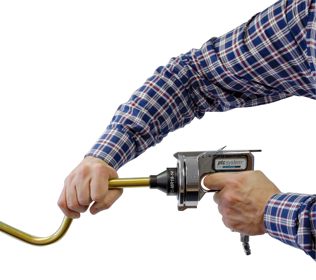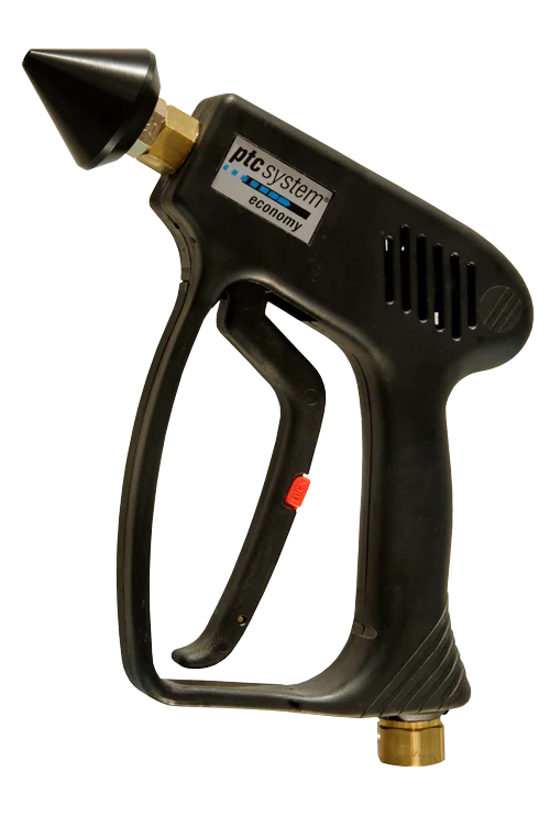 Werden lediglich kleine Mengen Schläuche oder Rohre mit ständig wechselnden Abmessungen gereinigt, kann der Einsatz der ptcsystem® DK6-40 ECO Pistole sinnvoll sein. Hierbei werden die Reinigungsprojektile zunächst von Hand in die Leitungen geschoben. Die Abdichtung erfolgt über den Außenkonus bis zu einem Innendurchmesser von 40 mm. Zum Einsatz kommt diese Variante beispielsweise auf Hydraulikservice Fahrzeugen.