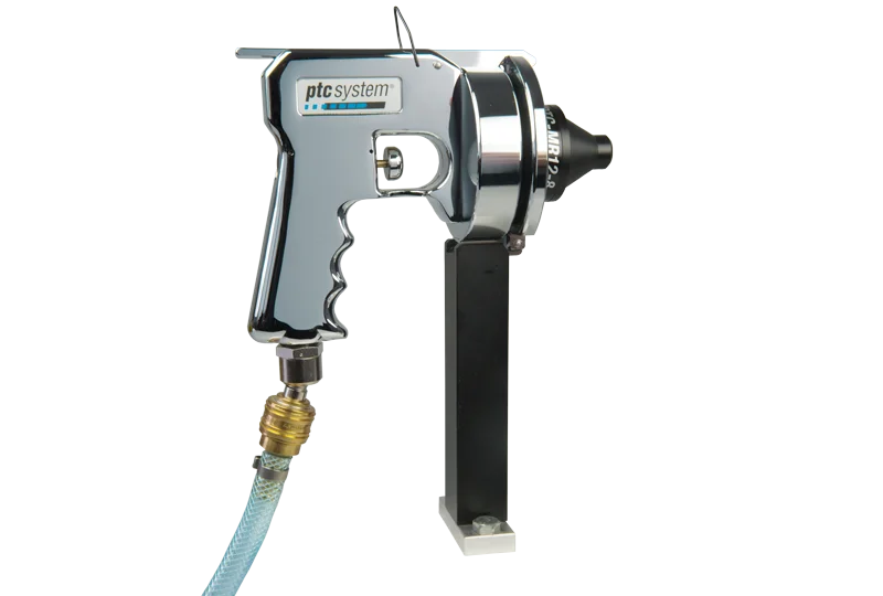 In Verbindung mit unserem Auffangbehälter eine perfekte Ergänzung für den Arbeitsplatz. Sie kann mit jeder bereits vorhandenen ptcsystem® Pistole verwendet werden. Der Austritt des Projektils wird über eine Lichtschranke erkannt und signalisiert. Der Reinigungsvorgang wird automatisch beendet. Fehlschüsse werden ebenfalls erkannt und optisch angezeigt. Erst nach Fehlerbestätigung durch den Bediener kann dieser weiterarbeiten.